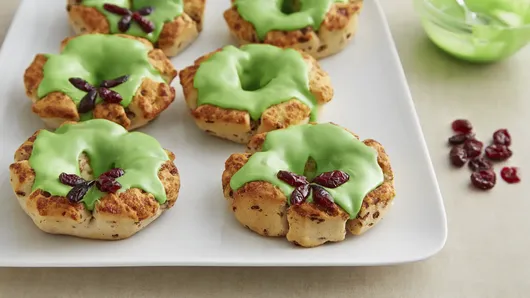 Step5Remove foil from wreaths, and transfer to serving tray. Spread icing on wreaths, and place 4 cranberries on each wreath in bow shape.