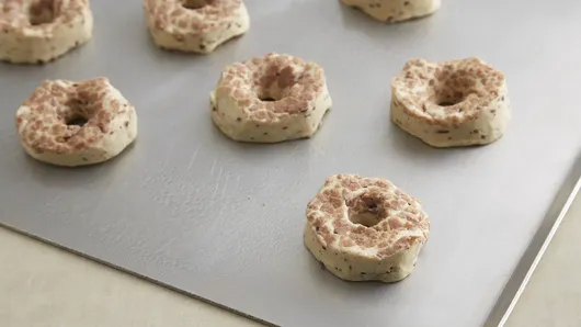 Step2Poke a hole in center of each cinnamon roll; spread open to about 1 inch in diameter, taking care not to tear dough.