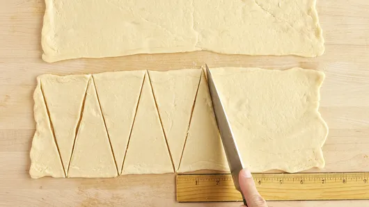 Unroll and separate dough into 2 long rectangles. Firmly press edges and perforations to seal, pressing each into 13x4-inch rectangle. Using photo as a guide, cut each rectangle into 8 triangles, each with 2 1/2-inch wide base (16 triangles total). Set aside trimmed end pieces. Place dough triangles on cookie sheet, spacing slightly apart. Press any perforations to seal, as needed.
