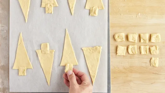 Shape and press remaining dough end pieces into 4-inch square. Cut into 4 rows by 4 rows to make 16 small squares. Press 1 square firmly at center of each triangle's short end for tree trunk.