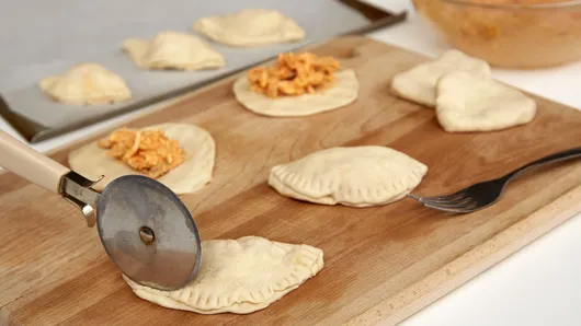 Step3Fold biscuit over filling; press edges with fork to seal. Using pizza cutter or sharp knife, trim forked edges of excess dough to look like football, and place on cookie sheet.