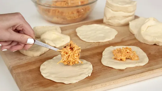 Step2Separate dough into 8 biscuits; cut each crosswise in half with serrated knife for total of 16 biscuit rounds. On work surface, press each half into a 4 1/2-inch circle; add a rounded tablespoon of chicken mixture to center of each circle.
