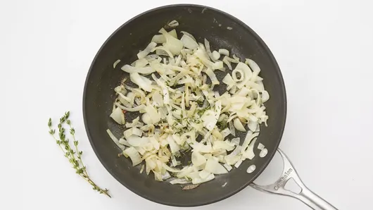 Step2In 12-inch nonstick skillet, melt butter over medium-high heat. Cook onions, garlic, broth and salt in butter 8 to 10 minutes, stirring occasionally, until onions are golden brown and most of the liquid is absorbed. Stir in thyme.