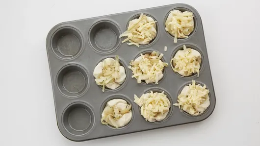 Step3Meanwhile, separate dough into 8 biscuits; cut each biscuit into 4 pieces. Place 4 pieces in each muffin cup, pointed ends up. Spoon 1 tablespoon onion mixture in center of each cup. Sprinkle each with 2 tablespoons cheese.