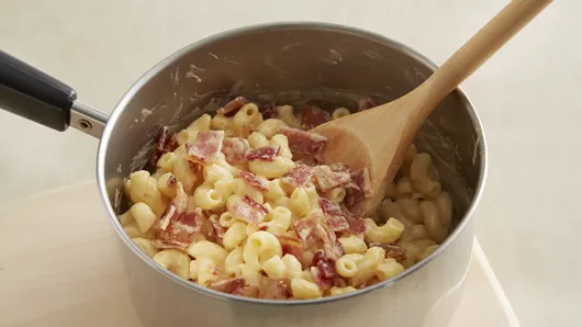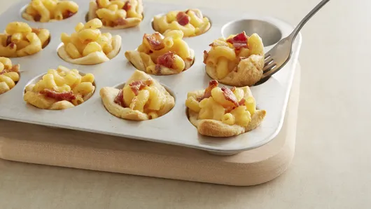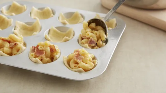 Step1Heat oven to 350°F. Spray 2 mini muffin pans with cooking spray. In 2- to 3-quart saucepan, heat evaporated milk, hot water, macaroni and salt to boiling over high heat. Reduce heat to medium; cook 7 to 9 minutes, stirring frequently, until pasta is tender and liquid is almost gone. Remove from heat; stir in cheese until melted, then bacon. Add more salt to taste, if desired.