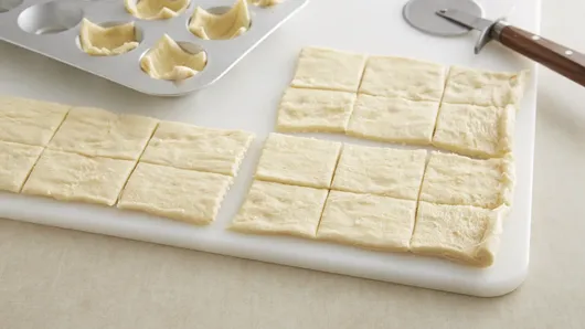 Step2Meanwhile, unroll crescent dough on work surface; create 4 rectangles by pressing diagonal seams together. Cut each rectangle in half the long way, then make 2 perpendicular cuts in each, creating a total of 24 smaller rectangles. Place 1 of the small rectangles in each muffin cup.