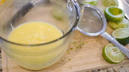 Step1In 2-quart nonreactive saucepan, beat 1 cup sugar, 4 eggs, 4 teaspoons grated lime peel plus 1/2 cup fresh squeezed lime juice (from about 4 limes) with whisk. Cook over medium-low heat about 10 minutes, beating constantly, until mixture is thickened.