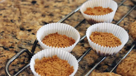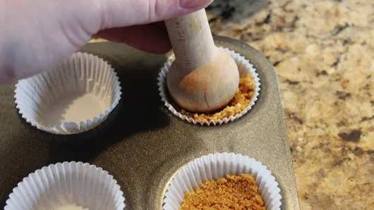 Step2In small bowl, mix graham cracker crumbs, sugar and 1/3 cup melted butter. Spoon 1 tablespoon mixture into each cup; press into cup with back of spoon.