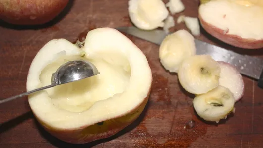 Step2Slice 8 medium to large apples to create a cup by removing one-fourth of the side of the apple. Cut a very small slice off the opposite side of each apple to create a base for the apple cups. Scoop out the flesh of the apples, making sure to leave at least a 1/8-inch border for sturdiness.