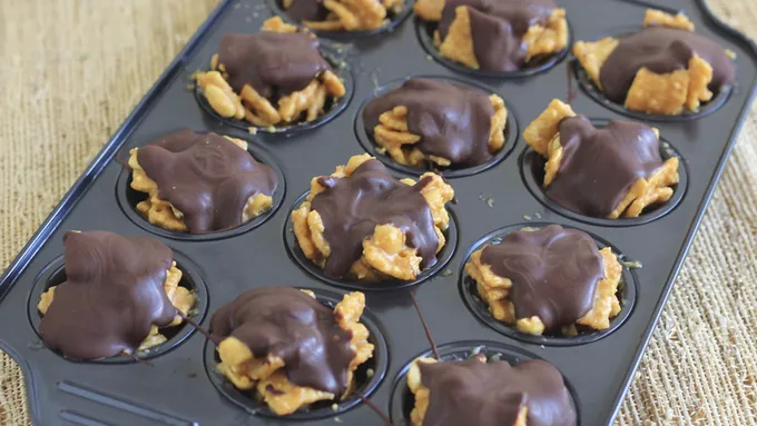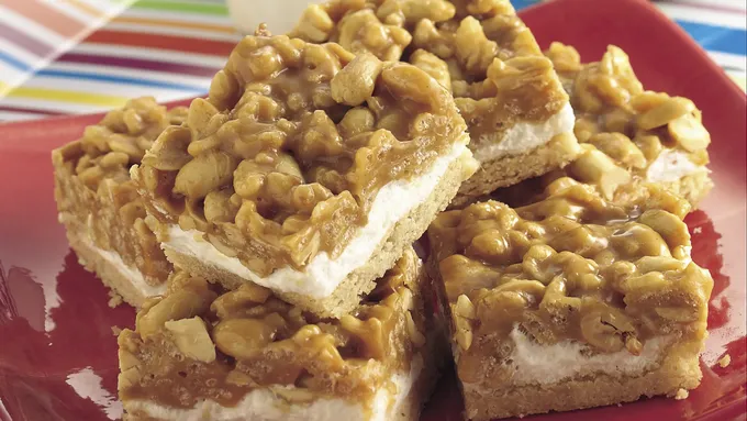 Step1Line 13 x 9-inch pan with foil. Spray foil with cooking spray. In large bowl, mix cereal, pretzels and peanuts; set aside.