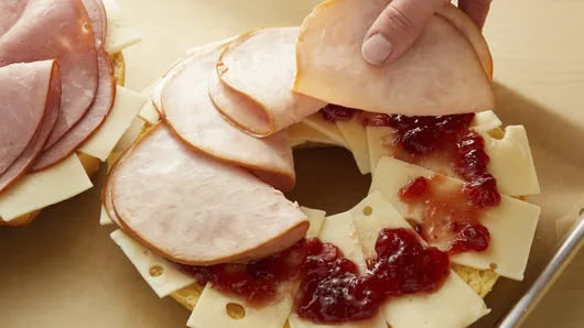 Use decorative side of bread ring for top of Bundtwich. Place 12 of the cheese slice halves evenly in decorative side of bread ring. Top with ham. Place remaining cheese slice halves, followed by jam and turkey, evenly in other side of bread ring. Bake 8 to 12 minutes or until cheese is melted and rings are hot.