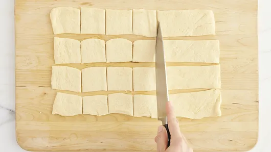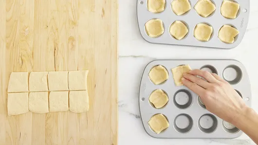 Step1Heat oven to 375°F. Spray 24 miniature muffin cups with cooking spray. Unroll crescent dough sheet into 12x8-inch rectangle. Cut into 6 rows by 4 rows to make 24 squares.