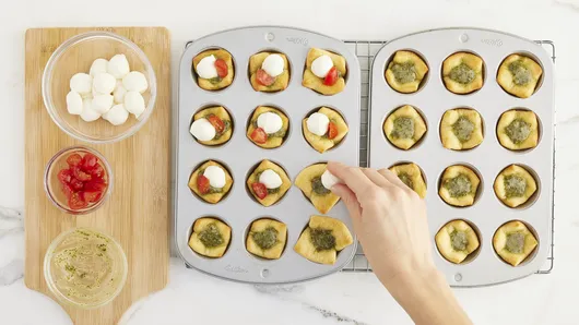 Mozzarella and pesto mini tarts are a deliciously easy appetizer you can whip up with only 20 minutes of prep. With only a handful of simple ingredients, these bite-sized starters couldn't be easier. Using your muffin tin, you can make your mini tarts with basil pesto, fresh mozzarella and tomato baked inside garlic-buttered crescent cups. These savory mini tarts are sure to be a hit for mealtime, game day celebrations, movie night and whenever you need a satisfying vegetarian snack.