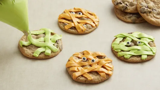 Step3Spoon colored frostings into decorating bags fitted with flat basket weave tip #45. Squeeze bag to pipe frosting in crisscross pattern over cookies to look like mummy bandages. Attach candy eyes. Let stand until set, about 20 minutes.