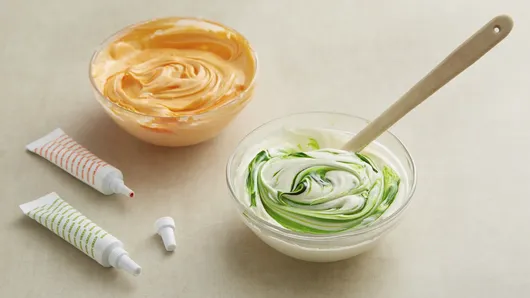 Step2Separate frosting into 2 small bowls; add food colors to make desired neon orange and neon green colors.