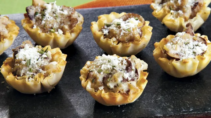 Step3Cut each rectangle into 12 squares. Place 1 square in each of 24 ungreased miniature muffin cups. Firmly press in bottom and up sides of cups, leaving corners of dough extended over edges of cups. Spoon 1 heaping teaspoon mushroom mixture into each cup.