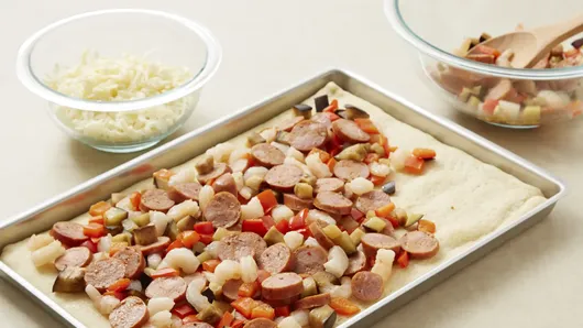 Step3Top partially baked crust with sausage mixture; sprinkle with cheese.