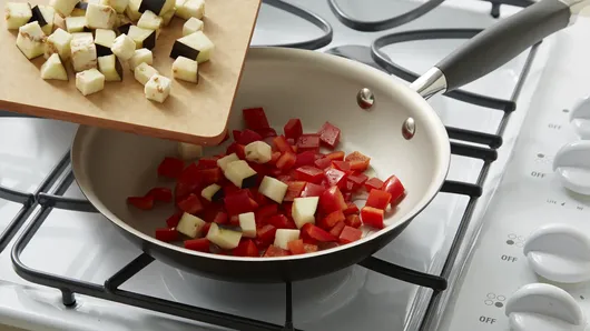 Step2In 12-inch skillet, heat oil over medium-high heat. Add eggplant and bell pepper; cook 4 to 5 minutes, stirring occasionally, until tender. Drain, if necessary. Return to skillet. Add sausage and shrimp; cook 2 to 3 minutes or until heated.
