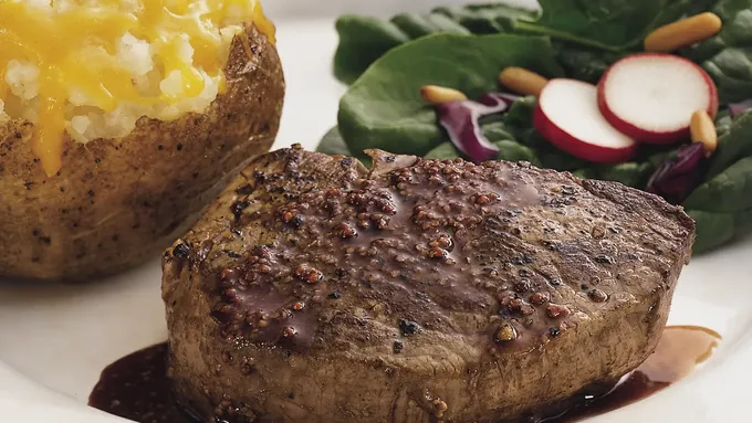 Step4To serve, place each steak on individual serving plate. Top each with peppercorn sauce.