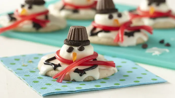 Step4Squeeze chocolate icing on largest flat side of each peanut butter cup; place over center opening of each marshmallow cookie to resemble head, pressing firmly.