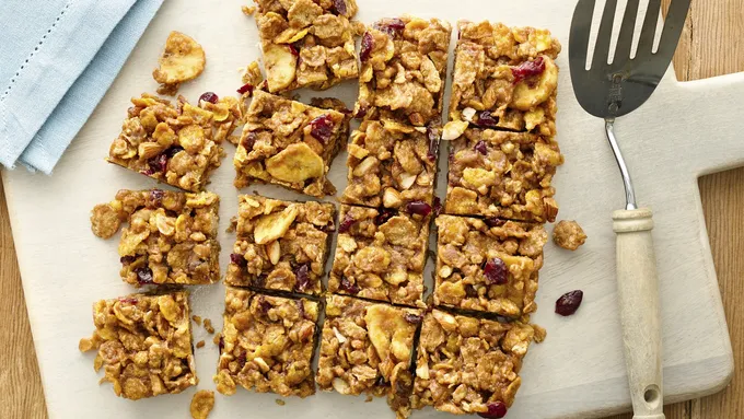 Step1Line bottom and sides of 8-inch square pan with foil or cooking parchment paper. Spray foil with cooking spray. In large bowl, mix cereal, oats, dried cherries and cacao nibs; set aside.