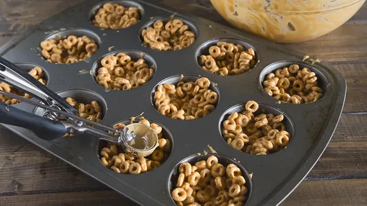 Step4Scoop about 1/4 cup cereal mixture into each muffin cup. With back of spoon or small cookie scoop, form indentation in each cup to hold “eggs”. Refrigerate 1 hour or until completely hardened.