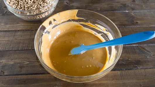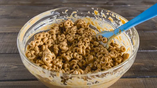 Step3Add 6 cups Cheerios™ cereal; stir until cereal is evenly coated.