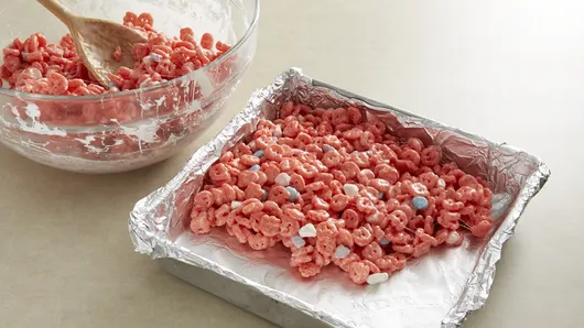 Step2Add cereal to marshmallow mixture; stir to combine, and add to square pan. With sprayed back of spoon, press mixture evenly in pan. Cool completely, about 30 minutes. Remove bars from pan. Cut into 6 rows by 3 rows.
