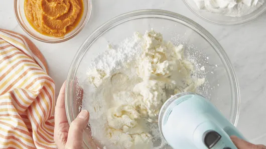 Step3In large bowl, beat cream cheese and powdered sugar with electric hand mixer on medium speed until blended. Beat in pumpkin and pumpkin pie spice until blended. Fold in whipped topping until blended.