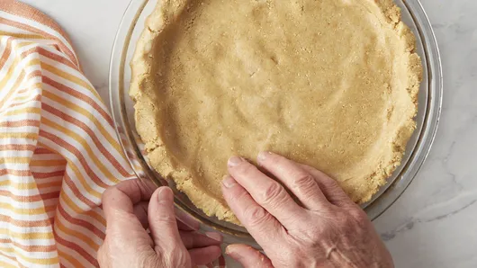 Step2Press mixture firmly and evenly into bottom and side of 9-inch glass pie plate. Store in refrigerator while making filling.