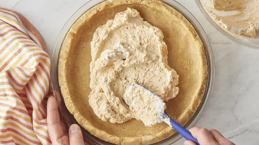 This recipe also calls for whipped topping, which is folded into the filling. Unlike whipped cream, whipped topping is designed to stay lofty and fluffy, and when gently added to this simple pumpkin pie filling, you get a perfect balance of sweetness, lightness and creaminess with all the flavors of pumpkin pie in each bite. (Bonus: You can top your finished pie with any leftover whipped topping just before serving.)