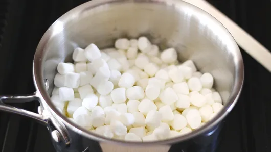 Step2In 2-quart saucepan, heat 1/4 cup unsalted butter over medium heat until completely melted. Add 4 cups miniature marshmallows; cook, stirring continuously, until marshmallows are melted.
