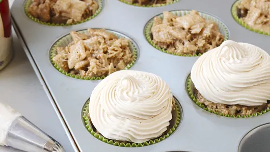Step5When cupcakes are cool, mix 1 container (16 oz) vanilla creamy ready-to-spread frosting with remaining 1 teaspoon ground cinnamon. Spoon frosting into decorating bag; pipe over tops of cupcakes.