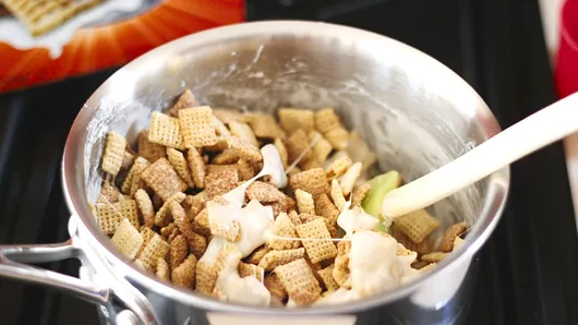Step3Remove saucepan from heat. Into melted marshmallows, gently stir 4 cups Cinnamon Chex™ cereal and about 1 teaspoon of the ground cinnamon (more or less depending on taste) until cereal is evenly coated.