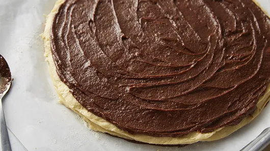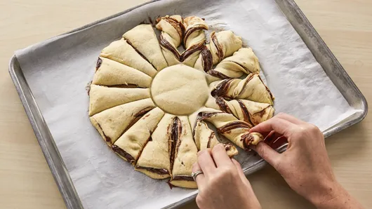 Carefully spread Nutella® jam mixture on top of the second dough circle. Lightly flour work surface, and unroll third can of crescent dough. Repeat steps to cut out another 10-inch circle, and quickly transfer on top of Nutella® jam layer.