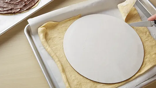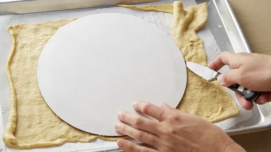 On parchment-lined cookie sheet sprinkled lightly with flour, unroll first can of crescent dough. Press or roll dough into 12x11-inch rectangle. Place 10-inch round dinner plate or cardboard circle on top of dough rectangle. Using a pizza cutter or sharp knife, cut away excess dough, and reserve for another use.