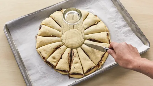 Place a glass or small jar with 2 1/2- to 3-inch opening in center of dough circle stack. Leaving center intact, use sharp knife to cut layered dough into quarters (12 o’clock, 3 o’clock, 6 o’clock and 9 o’clock). Divide each quarter into 4 equal parts, creating 16 total sections. Remove glass from center of dough.