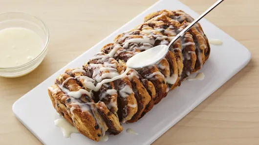 Step5In small microwavable bowl, beat cream cheese and icing with whisk until smooth. Microwave uncovered on High 10 to 15 seconds or until thin enough to drizzle. Drizzle on top of bread; serve warm.
