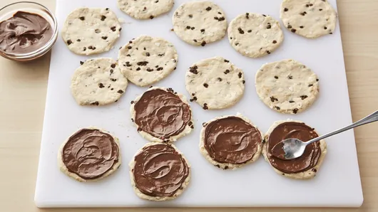 Step2Separate dough into 8 biscuits (set icing aside); split biscuits in half, making total of 16 biscuit rounds. Place on work surface or cutting board. Press dough into 3-inch rounds; spread 1 teaspoon hazelnut spread on one side of each of 15 of the biscuit rounds.