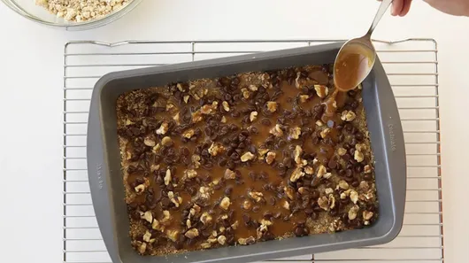 Step3Remove partially baked crust from oven; sprinkle with chocolate chips and nuts. Drizzle evenly with caramel mixture; sprinkle with reserved crumb mixture.