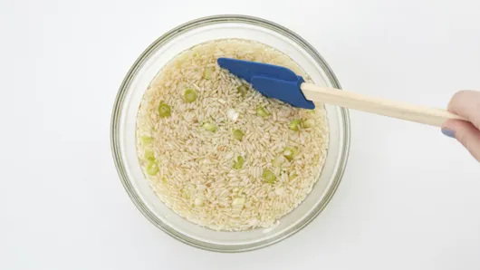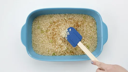 Step3Stir rice, broth, half of the green onions and 1 tablespoon of the glaze in baking dish.