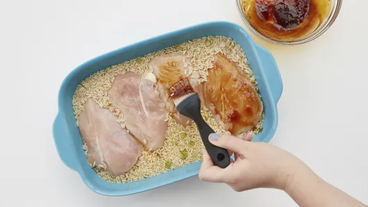 Step4Place chicken breasts on top of rice. Brush chicken with glaze. Cut pineapple rings in half, and place 2 halves on top of each chicken breast. Cover tightly with foil.