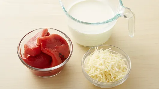 In blender, place roasted peppers, whipping cream and 1/2 cup of the Parmesan cheese. Cover and blend on medium speed until smooth. Set aside.