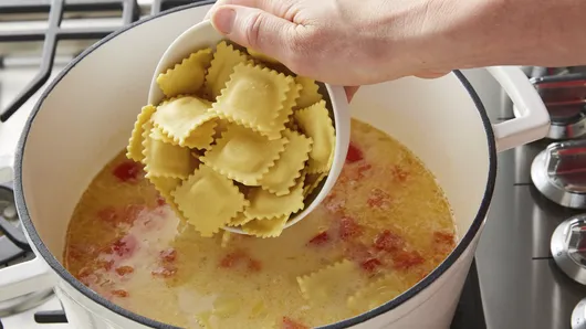 Step2Stir in broth, pasta sauce, chicken, Italian seasoning and pepper. Heat to boiling; stir in ravioli. Reduce heat; simmer 7 to 9 minutes, stirring occasionally, until ravioli is tender.