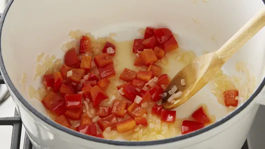 Step1In 5-quart Dutch oven, heat oil over medium-high heat. Add bell pepper and onion; cook 3 to 4 minutes, stirring frequently, until softened.