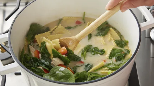 Creamy Tuscan chicken and frozen ravioli team up to make this incredibly cozy One-Pot Tuscan Ravioli Soup that’s loaded with flavor, but super easy to make—we’re talking throw-a-handful-of-ingredients-in-just-one-pot easy. Best of all, this one-pot Tuscan soup requires minimal cleanup, so you can get back to family time.