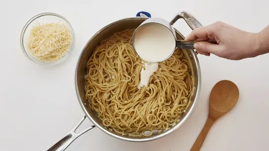 Step2Add chicken broth, spaghetti and pepper; heat to boiling. Simmer 10 to 12 minutes, stirring occasionally, until most of liquid is absorbed and pasta is al dente. Stir in 3/4 cup of the Parmesan cheese and the whipping cream just until heated through.