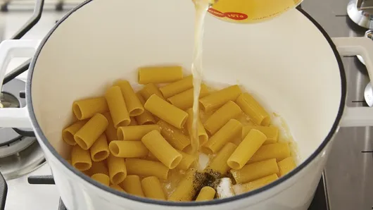 Step2Add chicken broth, lemon juice, rigatoni, salt and pepper. Heat to boiling. Simmer uncovered 14 to 16 minutes, stirring occasionally, until pasta is al dente and most of liquid is absorbed.