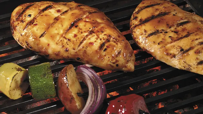 Step4Add carrots and sugar snap peas to baking pan. Brush chicken and vegetables with remaining glaze. Bake an additional 15 to 20 minutes or until chicken is fork-tender, juices run clear and vegetables are tender.