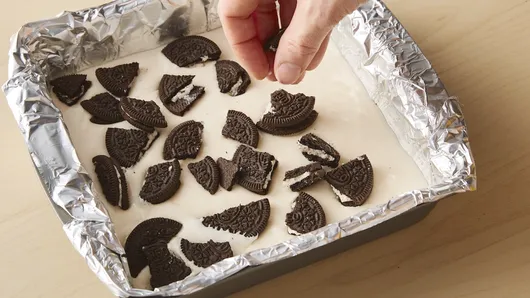 Step3Add marshmallow creme, candy coating and vanilla; blend until smooth. Pour half of mixture into buttered foil-lined pan. Sprinkle cookie pieces over entire surface. Top with remaining mixture. Cool 30 minutes or until completely cooled. Refrigerate 1 to 2 hours or until firm.